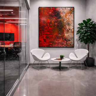 At 48 by 60 inches, this painting commands space. It was made to stand out. The scale allows the contrast to breathe while still hitting with impact. From across the room, the red pulls you in.